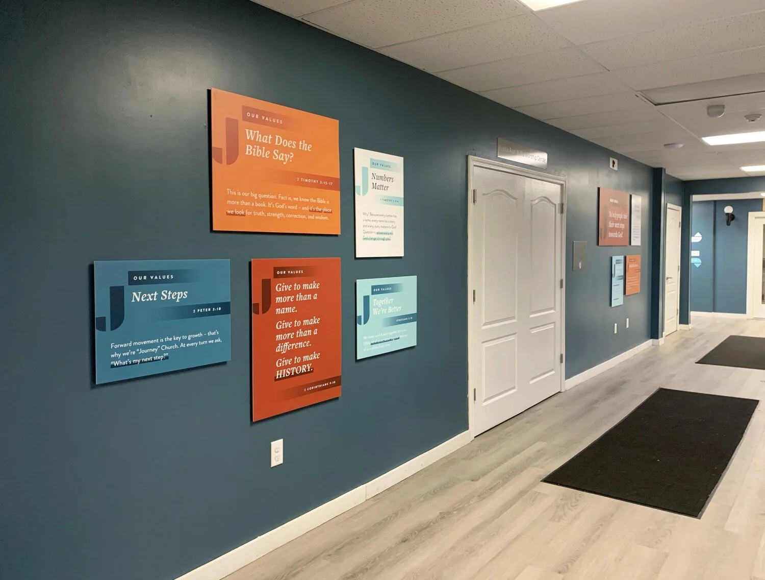The church I was attending at the time requested new branding. My husband (who is also a designer) and I were happy to step in and create a logo representing the goal of Journey Church which is always helping people take their next step towards God. I expanded that into the branding throughout the church – signage, print materials, presentation slides for services, social imagery, and even a graphic for their podcast, Milk & Humor. My husband did an amazing job with the website.